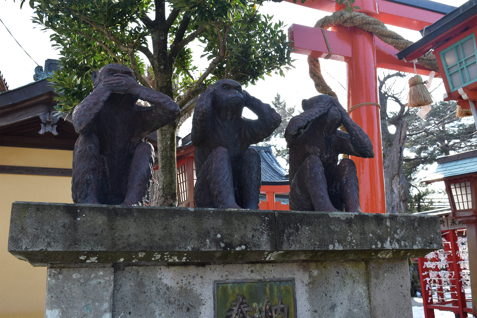 境内を散策されますと、御幣を持った猿を始め親子猿、手水舎屋根の猿、「見ざる、聞かざる、言わざる」即ち「良きことを見、良きことを聞き、良きことを言う」という教えの「三猿」など、あちらこちらに猿の姿が見られます。
